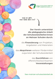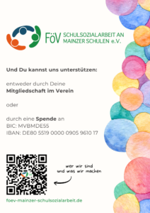 Mainzer Kinder und Jugendliche stark fürs Leben machen – das ist unser Ziel!Der Förderverein Schulsozialarbeit an Mainzer Schulen e. V. unterstützt die pädagogische Arbeit der Mainzer Schulsozialarbeit durchdie Finanzierung von Projekten und Angebotendie Finanzierung von Anschaffungen und Materialiendas Akquirieren weiterer Fördermittel zugunsten der Schulsoziarbeitdas Durchführen von öffentlichkeitswirksamen VeranstaltungenUnd Du kannst uns unterstützen:entweder durch Deine Mitgliedschaft im Verein oder durch eine Spende.